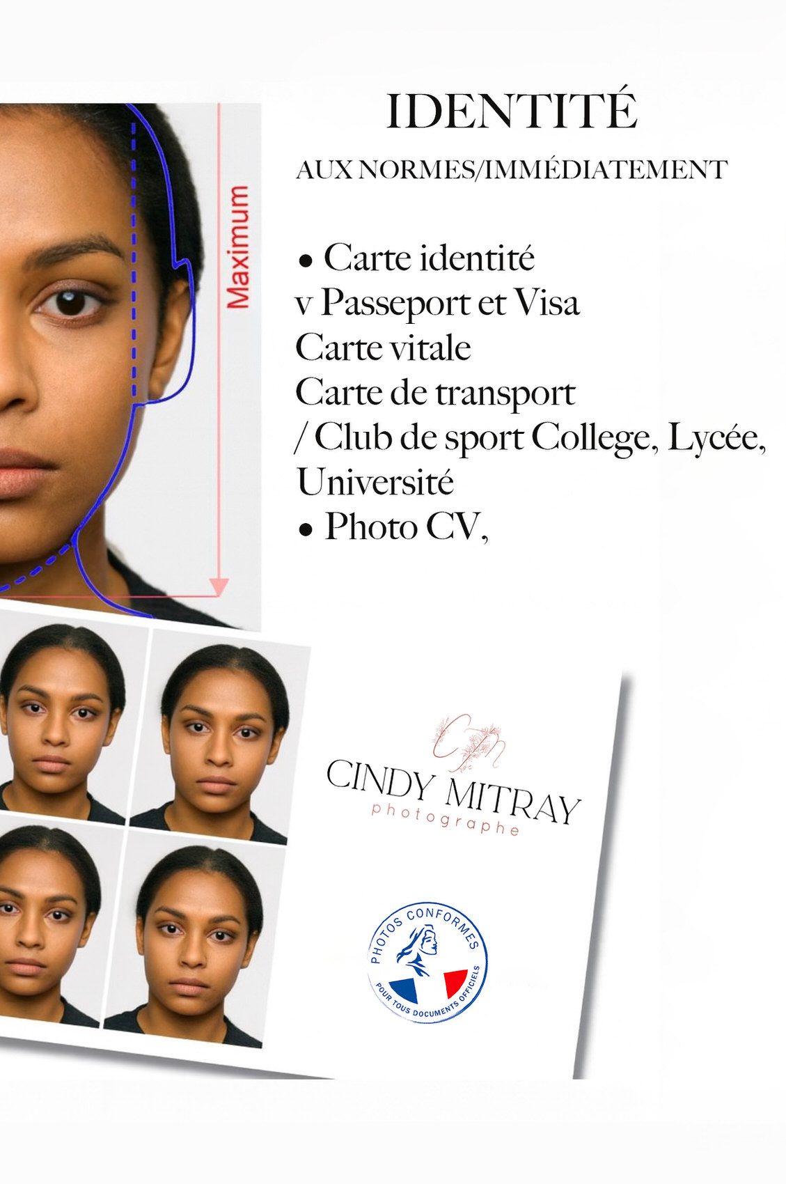 Notre studio réalise tous types de photos d’identité conformes aux normes françaises et internationales sans rendez-vous :